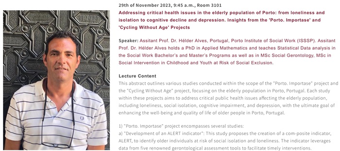 No próximo dia 29 de Novembro de 2023, o docente do ISSSP, Hélder Alves, irá lecionar uma aula no evento "Interdisciplinary International Lecture Series", com o tema "Addressing critical health issues in the elderly population of Porto: from loneliness and isolation to cognitive decline and depression. Insights from the 'Porto. Importa-se' and 'Cycling Without Age' Projects".