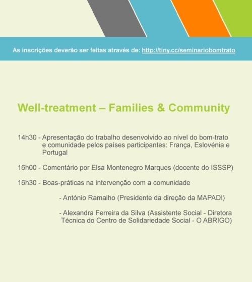 O seminário "Olhares cruzados Europeus sobre o bom trato das pessoas em instituições especializadas" decorre no dia 11 de outubro, pelas 14h30, no auditório do ISSSP. Para se inscrever no seminário preencha o formulário de inscrição em http://tiny.cc/seminariobomtrato.